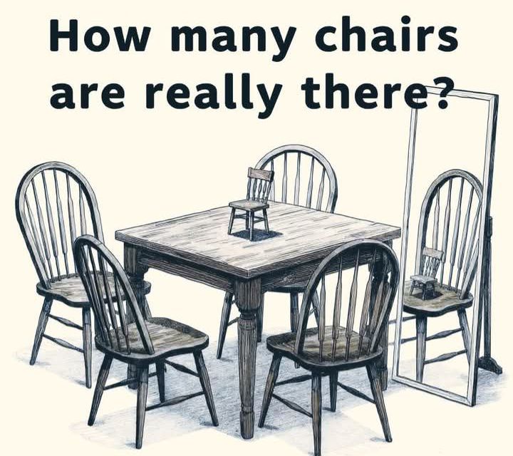 At first glance, the image seems almost ordinary. A wooden table stands at the center of a room, surrounded by chairs. A small chair sits on top of the table. To the right, a tall mirror reflects part of the scene. Above the illustration, a simple question challenges the viewer: